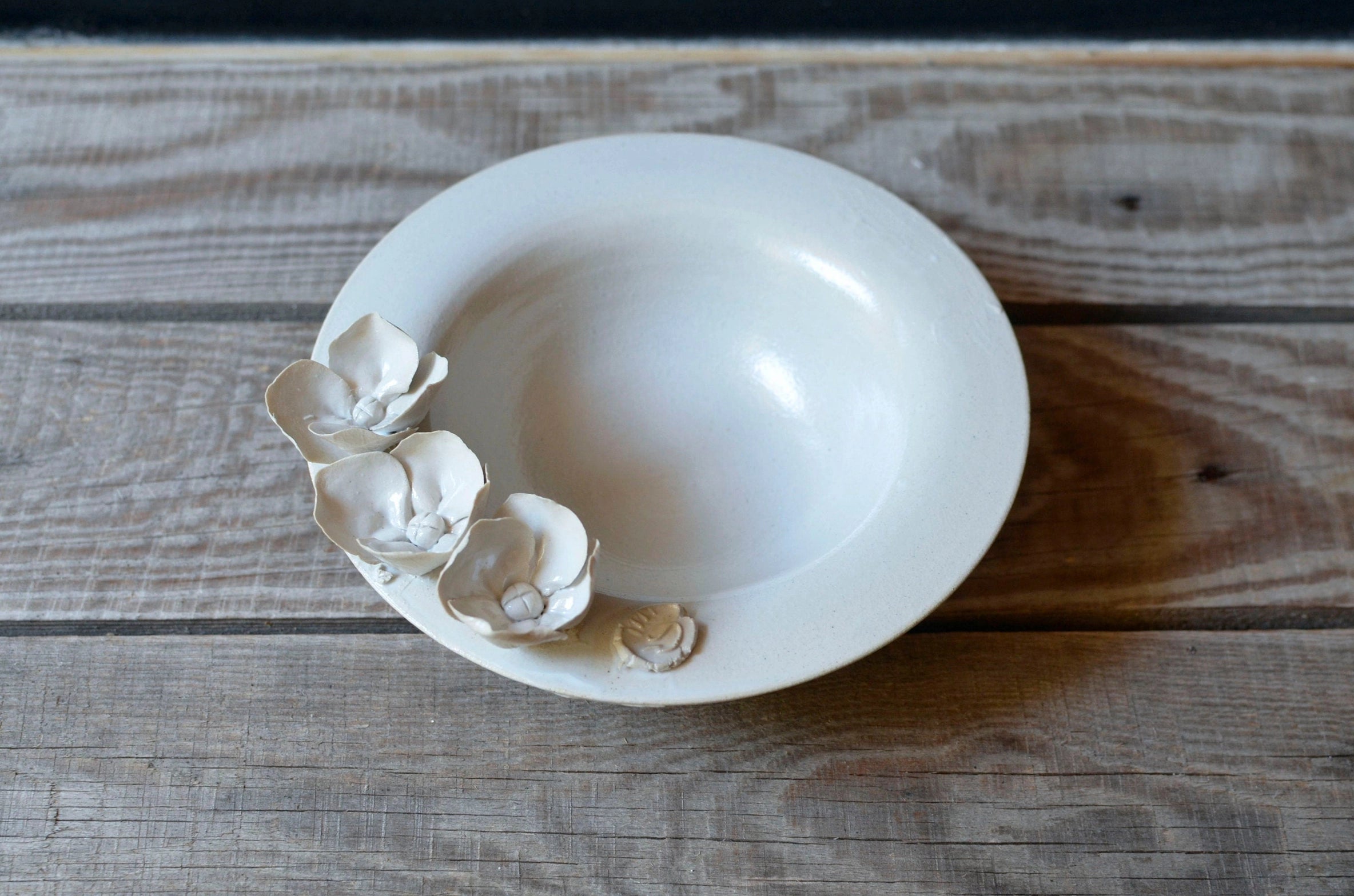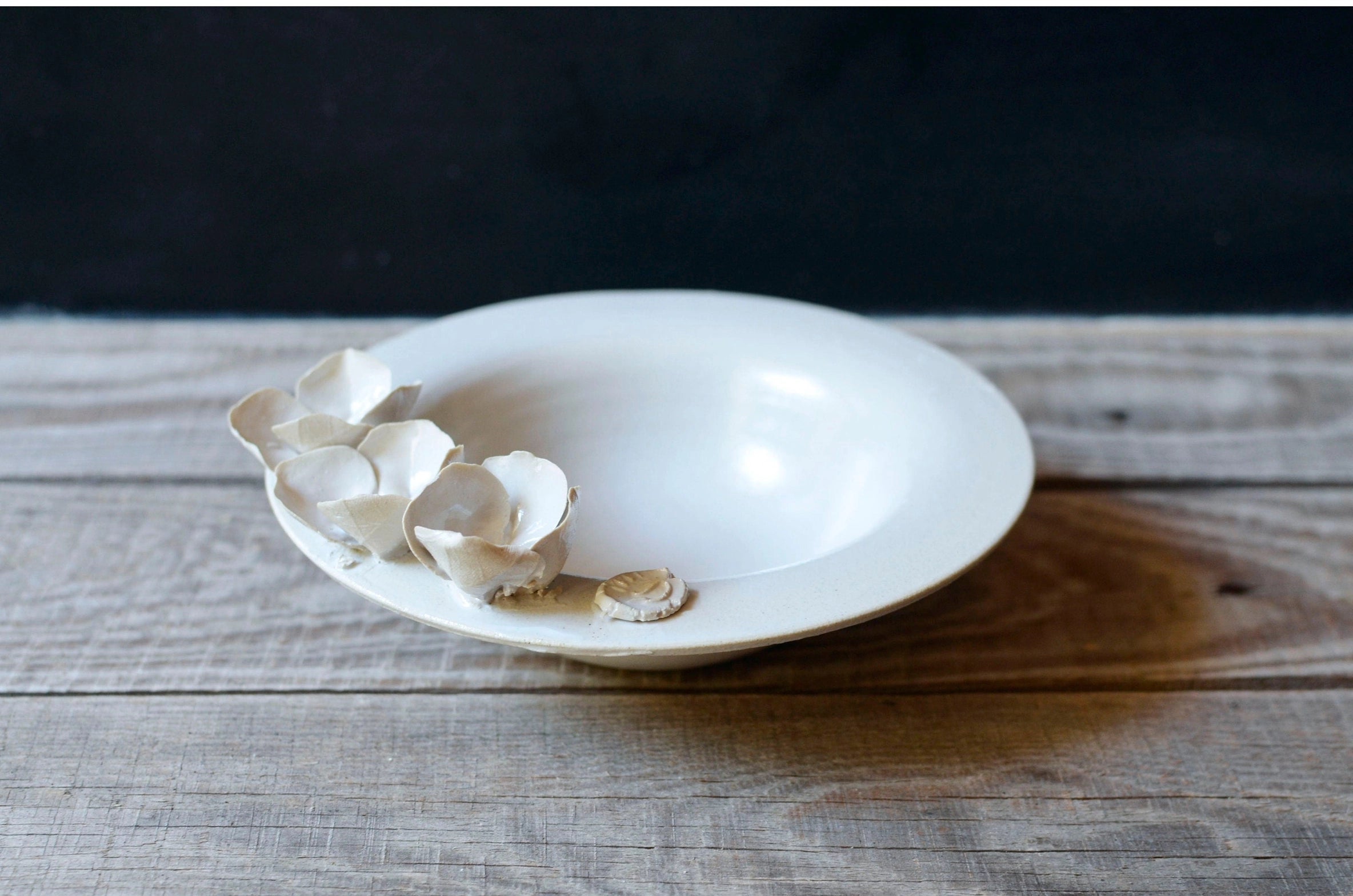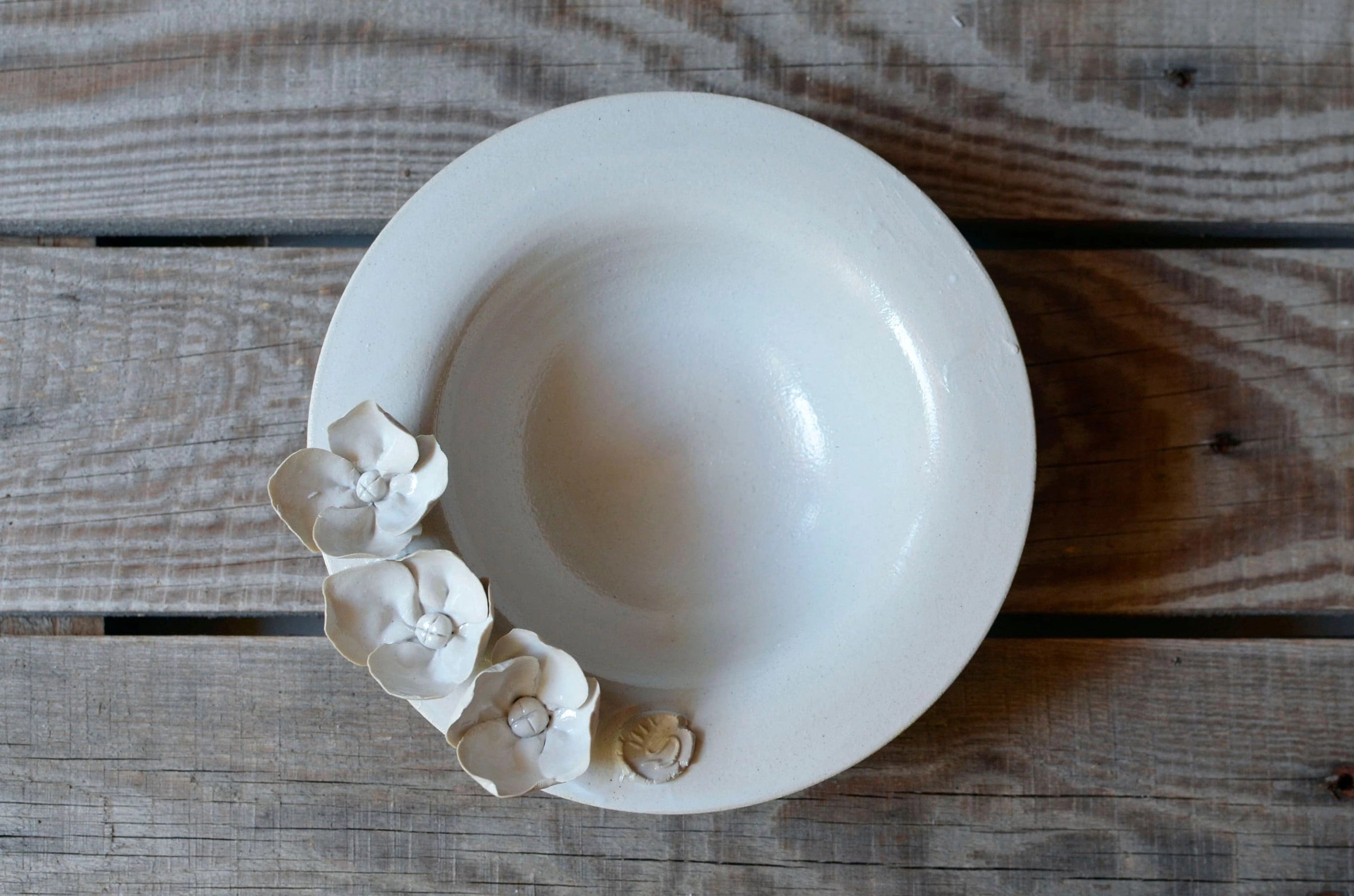 This stoneware bowl is wheel-thrown and finished with the delicate application of three small floral details. Soft in form and poetic in character, it brings a gentle, romantic touch to any interior—perfect for holding fragrant potpourri or as a thoughtful, special gift.